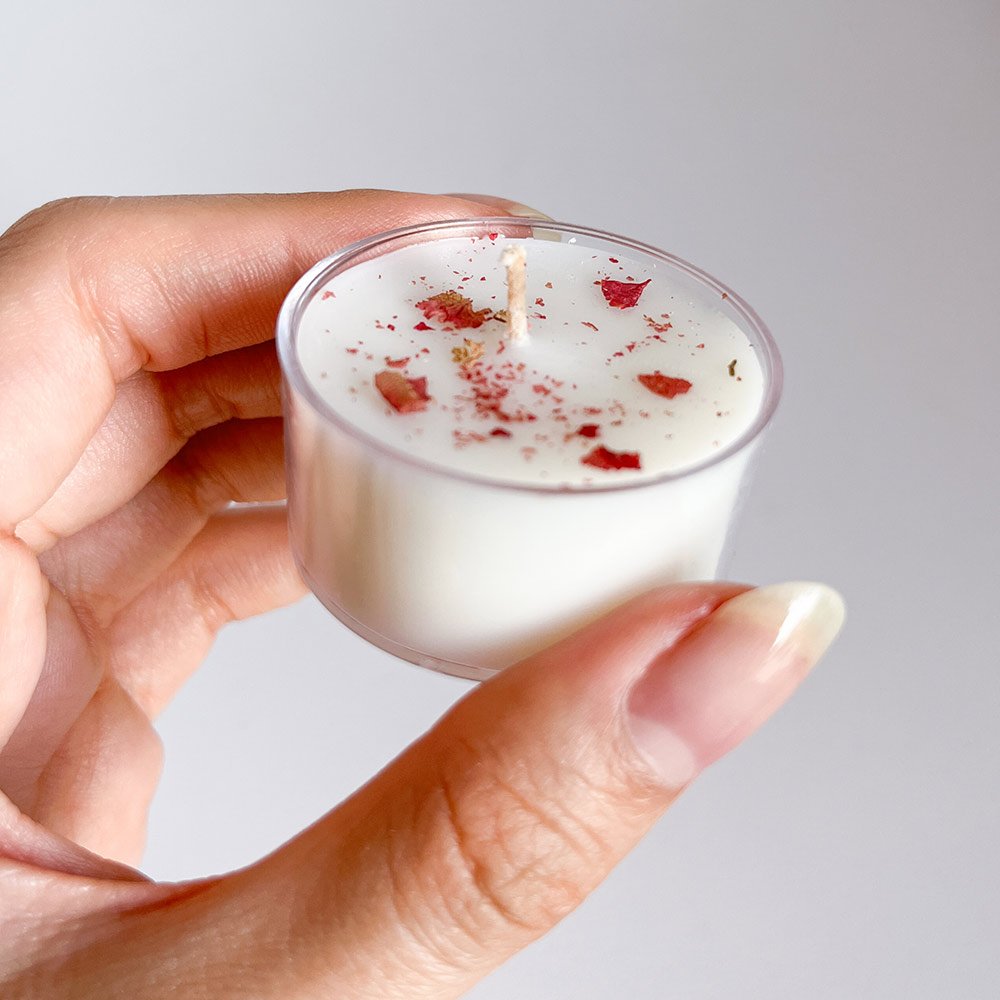 – Vela con aroma decorada con pétalos de flores para llenar de significado.