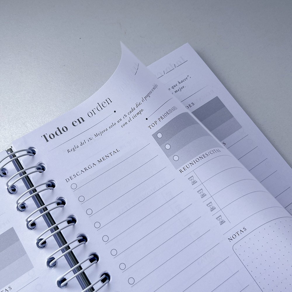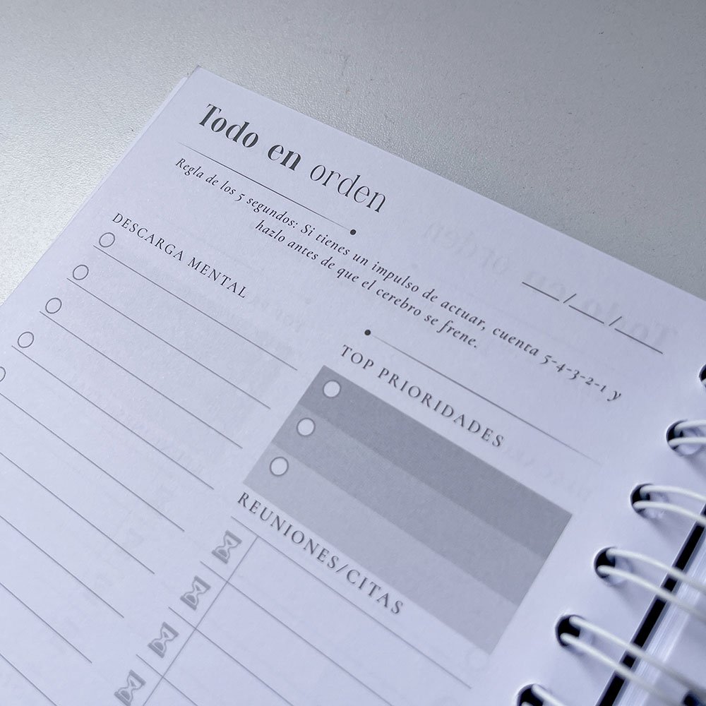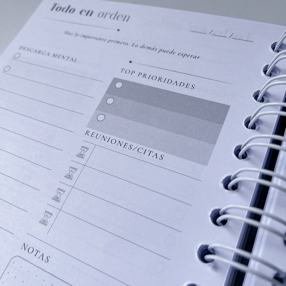 Su diseño único incluye páginas para hacer descargas mentales, priorizar 3 tareas principales y descubrir los mejores secretos de la productividad. Al final, encontrarás hojas de notas ideales para plasmar tus ideas, conocimientos y detalles importantes.